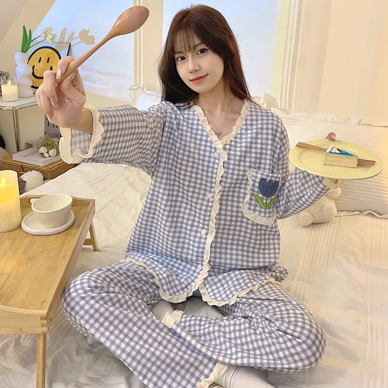 M-5XL Plus size Sleepwear Woman Cotton Pyjamas Women Long sleeve Pajamas Set Japanese Loose Grid Cute Loungewear